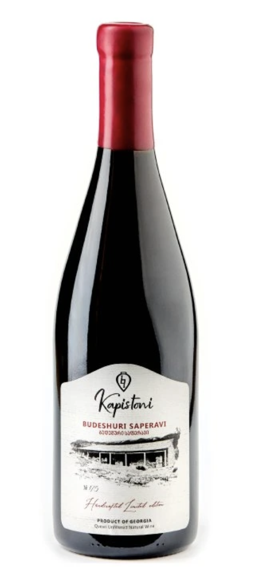 Budeshuri Saperavi 2020 z vinařství Kapistoni je suché kvevri červené víno, vyrobené z odrůdy Budeshuri Saperavi, která je klonem známé gruzínské odrůdy Saperavi. Hrozny pocházejí z regionu Kartli v Gruzii, konkrétně z oblasti Gori, kde vinice leží v nadmořské výšce 750 metrů na jílovitých půdách. Toto víno z Gruzie je výsledkem tradičního gruzínského vinařství, které využívá hliněné nádoby zvané kvevri pro fermentaci a zrání vína. Fermentace probíhá přirozeně s použitím divokých kvasinek, přičemž víno zůstává několik měsíců na kvasnicích, což přispívá k jeho komplexnosti a hloubce chuti .